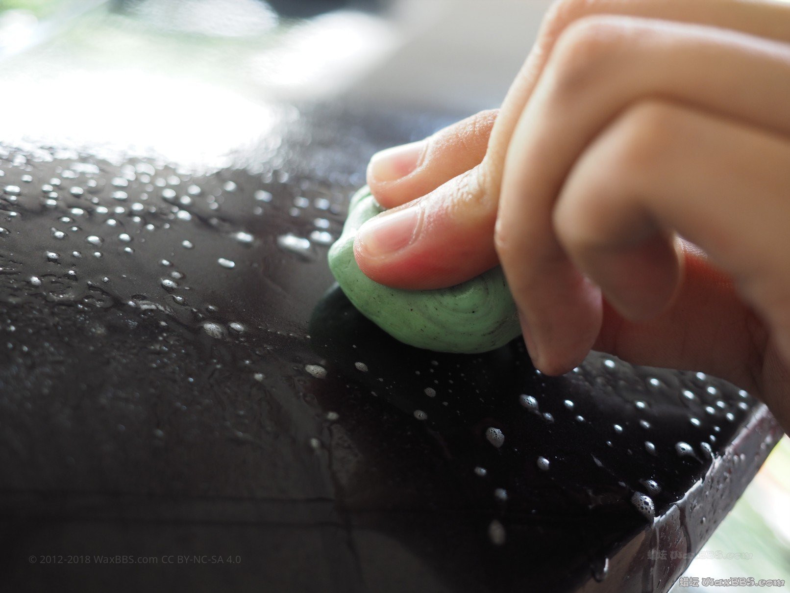 2、 用洗车手套+小细刷+洗车液把车洗干净,洗完后走一遍粘土,再洗一次车。