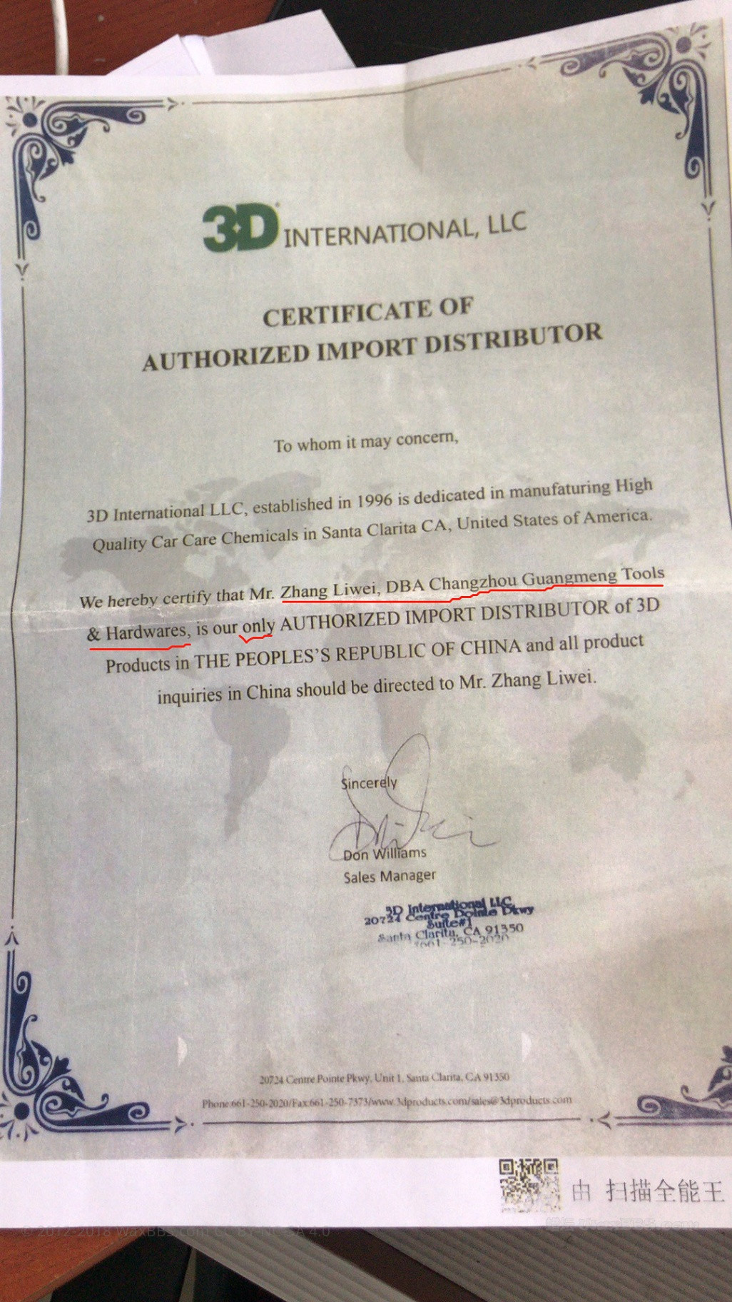 上图是美国3D总部授权中国唯一总代理的授权书。被授权人是常州广盟五金工具公司的张立伟。