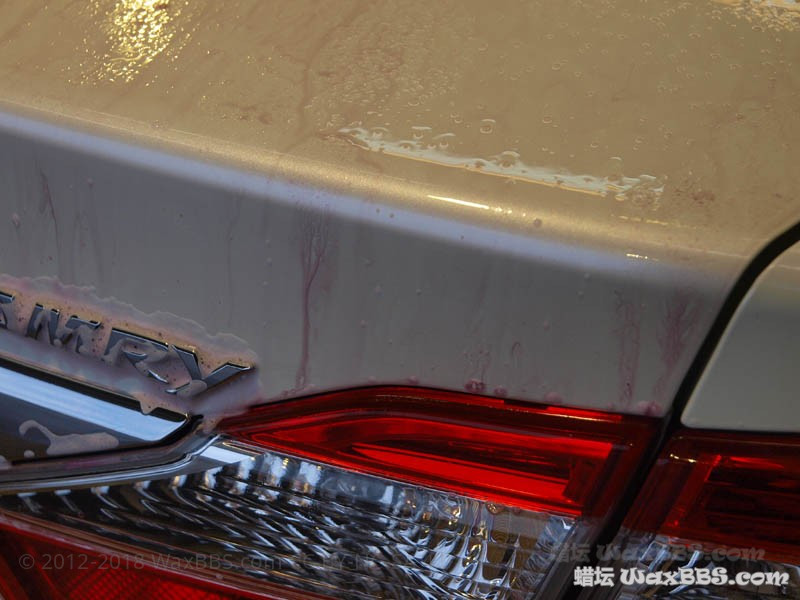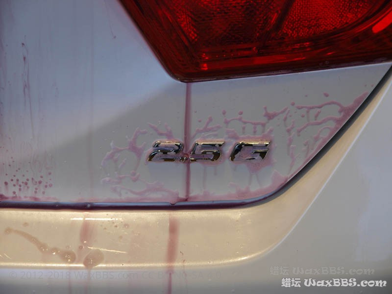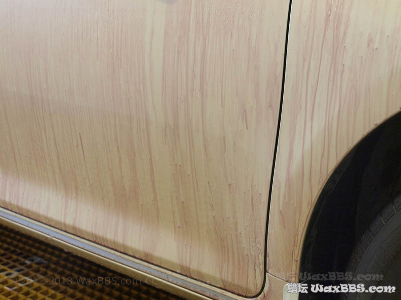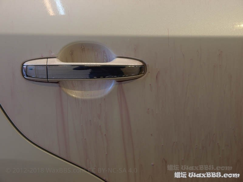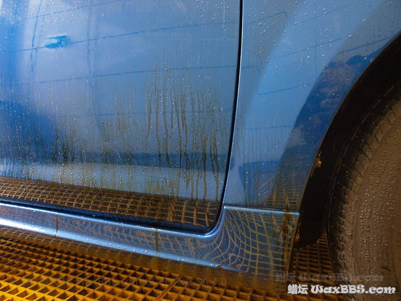 因为之前花了四个小时镀膜,很多镀膜剂没有探试干净,而且没有脱脂,全车只有一块块残留镀膜上还有效果,别的地方已无泼水效果。