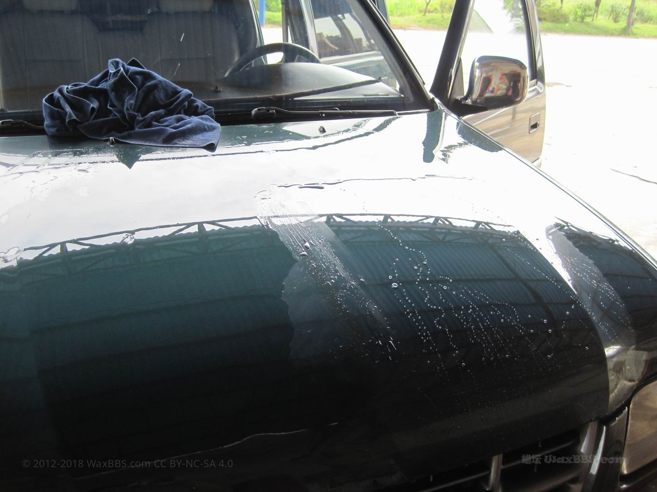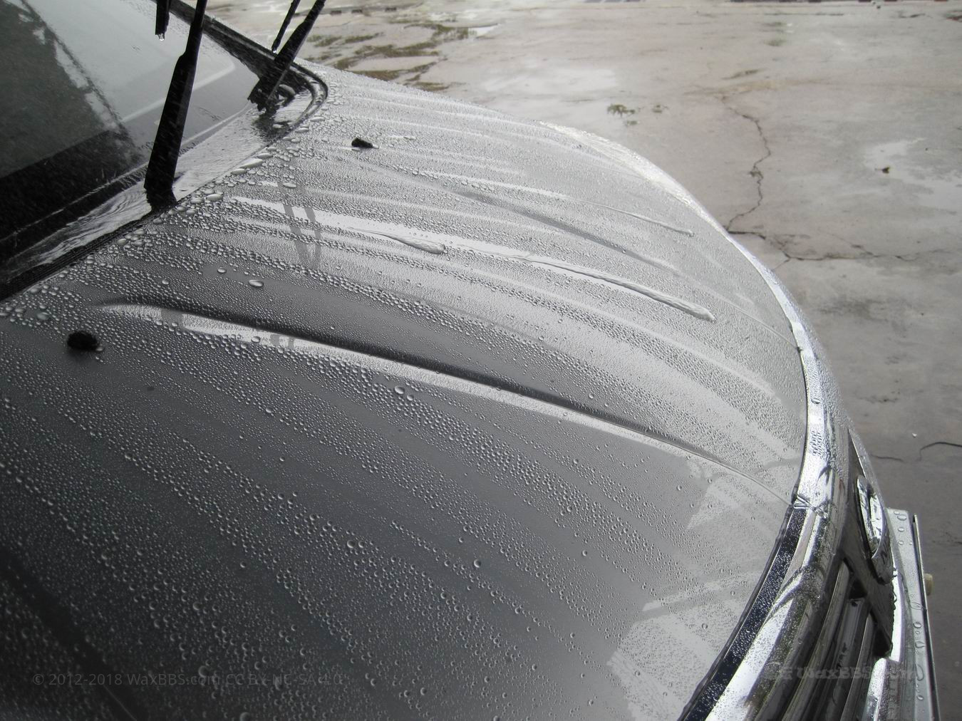 ②驱水形态:下面这个图片就是驱水形态的漆面了。洗车时冲水后,这类漆面为什么这样呢?这是封体剂的效果,有部分的蜡也有这样的效果,但多数都是封体剂。有些人去美容店做的所谓封釉,也就是这样的效果,小弟推断市面上所谓的封釉,就是用封体剂做出来的。冲水后,漆面一大片的水迅速散开,停留的水珠比较少。这就是驱水形态的漆面了。这时的漆面有一层漆面密封剂作为保护膜,对漆面有一定的保护作用。