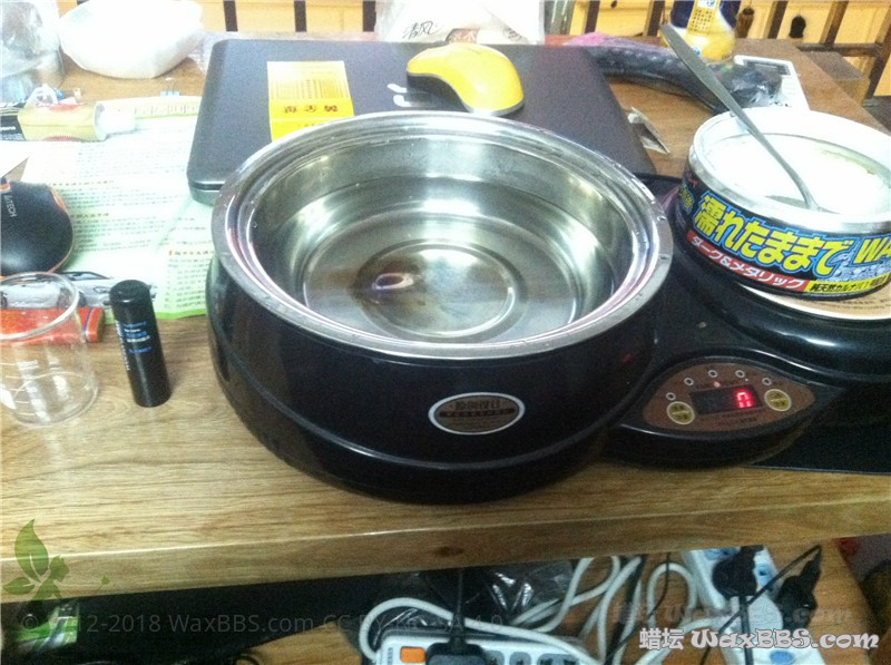 101氏摄度了,蜡还没有完全溶解,还需要煮一下,为了不让蜡里的溶剂挥发太多,我们用保鲜袋包好了杯子口