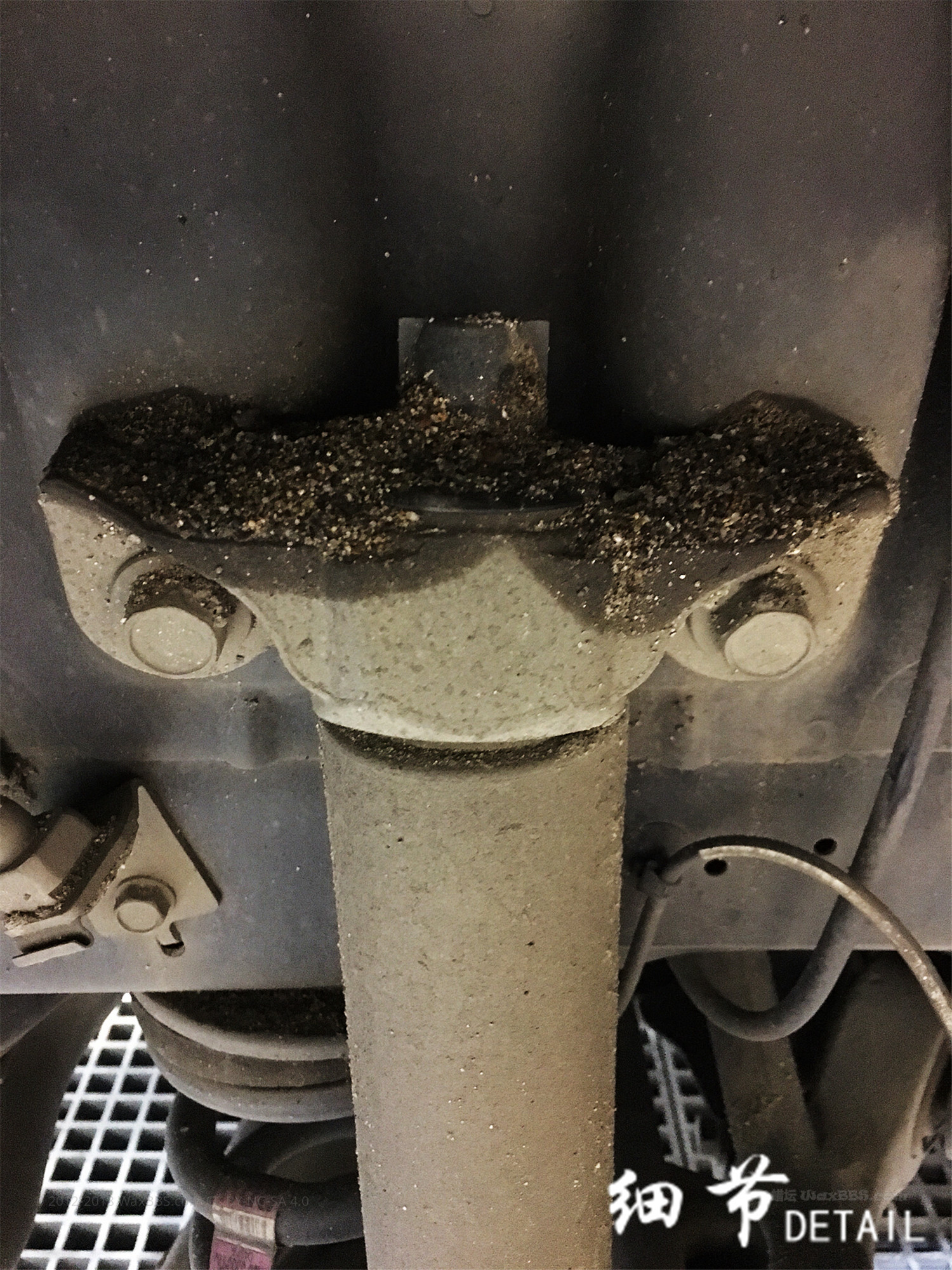 轮圈内部和悬挂系统积满了泥沙。由于是后轮驱动,后轮避震塔顶位置尤其严重。必须清洗干净,以免泥沙摩擦到避震筒油封导致漏油,到时候就麻烦了。