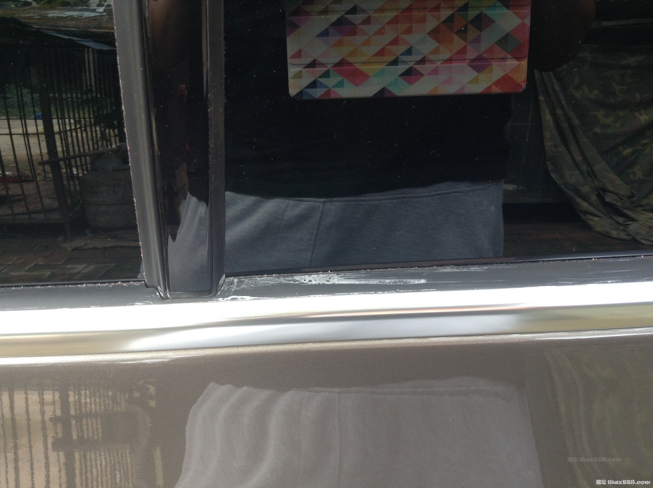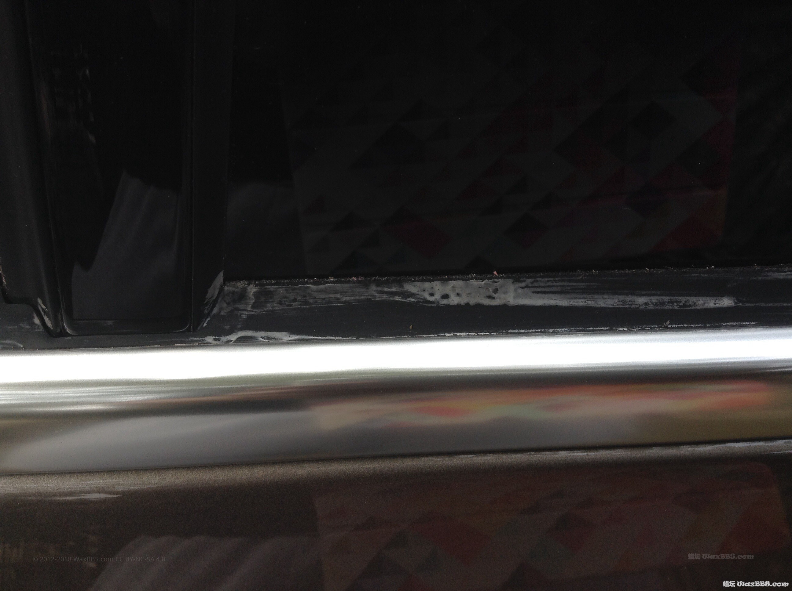 我承认我手贱,那天我蹲在墙根吃黄瓜,突然灵感一现,考虑到如何更好的保护车外胶条部件,预防老化龟裂。。。。 扔掉手中的黄瓜,找来棉签,直接沾PERL原液把车外胶条部分全部擦了一遍,结果请看下图。。。。 问:该如何清理?这是保护了胶条还是更破坏了胶条?